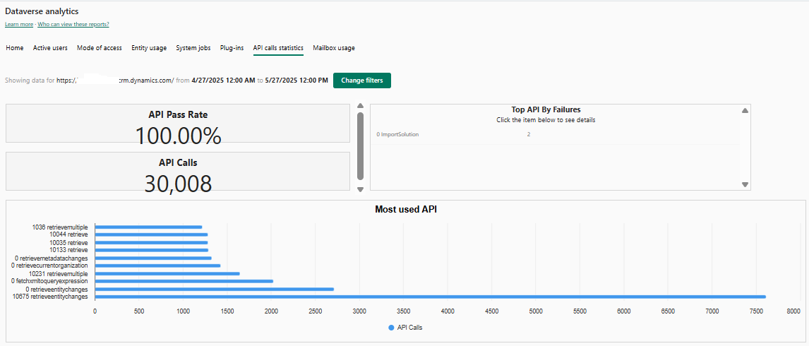 Immagine della pagina delle metriche delle chiamate alle API di analisi Dataverse.