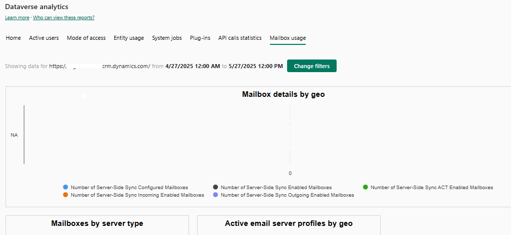 Mostra la schermata dei dettagli sull'utilizzo della casella di posta di Dataverse Analytics.