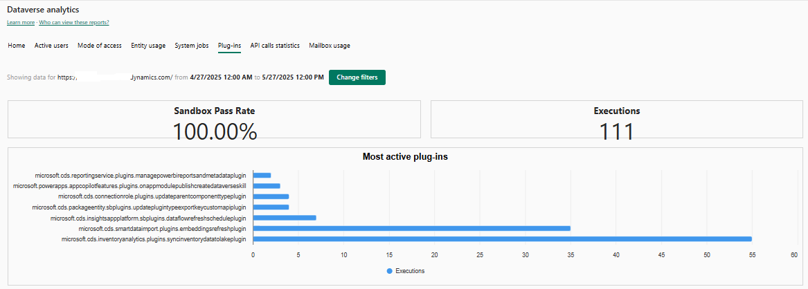 Plug-in più attivi Elenco dei 10 plug-in più eseguiti nell'ambiente con un database in un periodo di tempo specificato. Dataverse