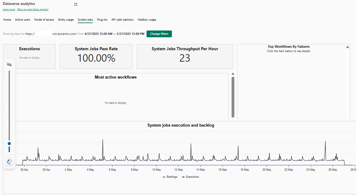 Esecuzioni e backlog Questo grafico mostra il numero di esecuzioni e il backlog per i processi di sistema nell'ambiente con un database Dataverse in un periodo di tempo specificato.