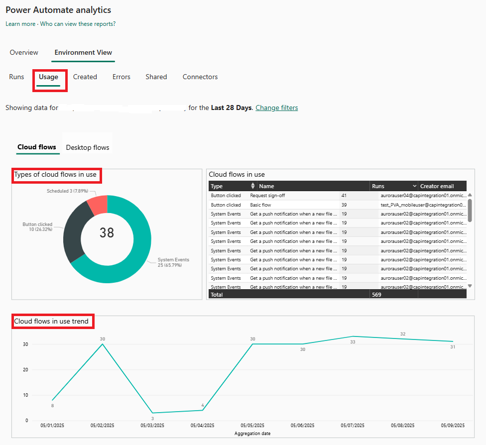 Gli amministratori dell'ambiente possono accedere all'analisi per Power Automate nell'interfaccia di amministrazione di Microsoft Power Platform. I report forniscono informazioni dettagliate su esecuzioni, utilizzo, errori e tipi di flussi creati, ad esempio flussi automatizzati, attivati da pulsanti, pianificati, di approvazione e processo aziendale. Includono anche dettagli sui flussi condivisi e sui connettori associati a ogni tipo di flusso. Tuttavia, questi report non includono informazioni dettagliate per i flussi desktop.