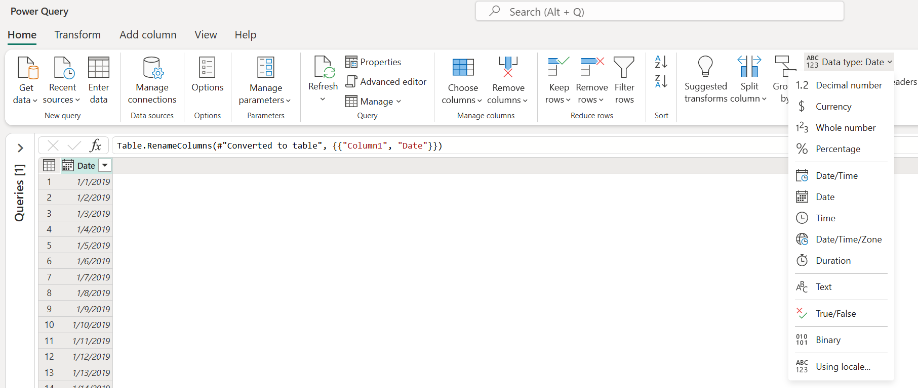 Nel gruppo Trasforma della scheda Home del menu a discesa Tipo di dati.
