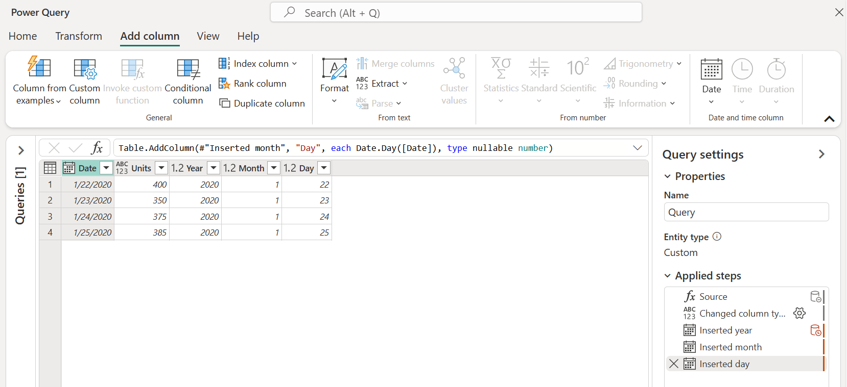 Il valore di globalizzazione determina la formattazione dei valori di data. Se si verificano dubbi sul valore visualizzato da Power Query, è possibile verificare la conversione dei valori di data aggiungendo nuove colonne per il giorno, il mese e l'anno dal valore. Per aggiungere queste nuove colonne, selezionare la colonna Data e passare alla scheda Aggiungi colonna sulla barra multifunzione. Nel gruppo di colonne Data e ora vengono visualizzate le opzioni per una colonna data.