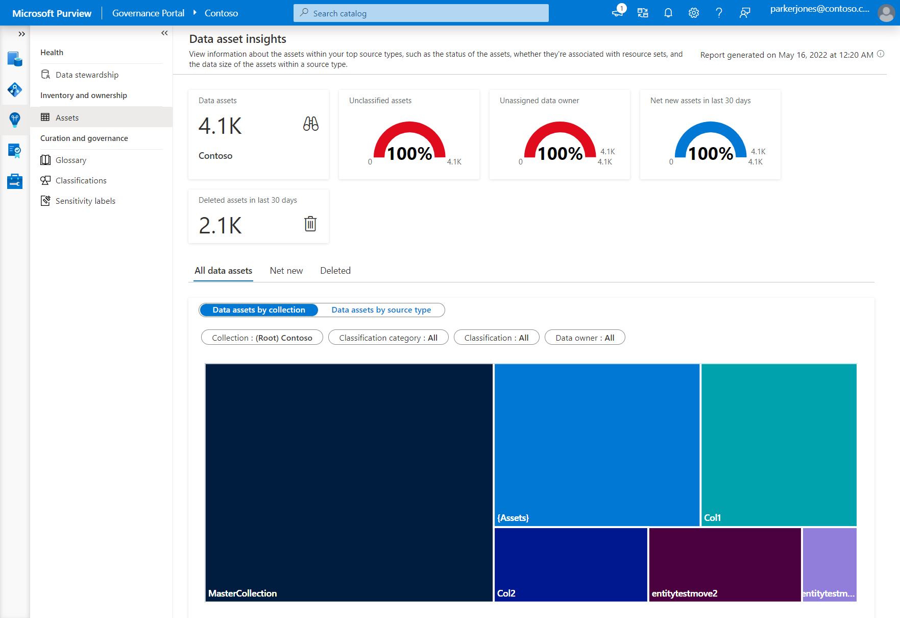 Questo report fornisce un riepilogo del patrimonio dati e della relativa distribuzione in base alla raccolta e al tipo di origine. È anche possibile visualizzare nuovi asset, asset eliminati, asset aggiornati e asset non aggiornati degli ultimi 30 giorni.