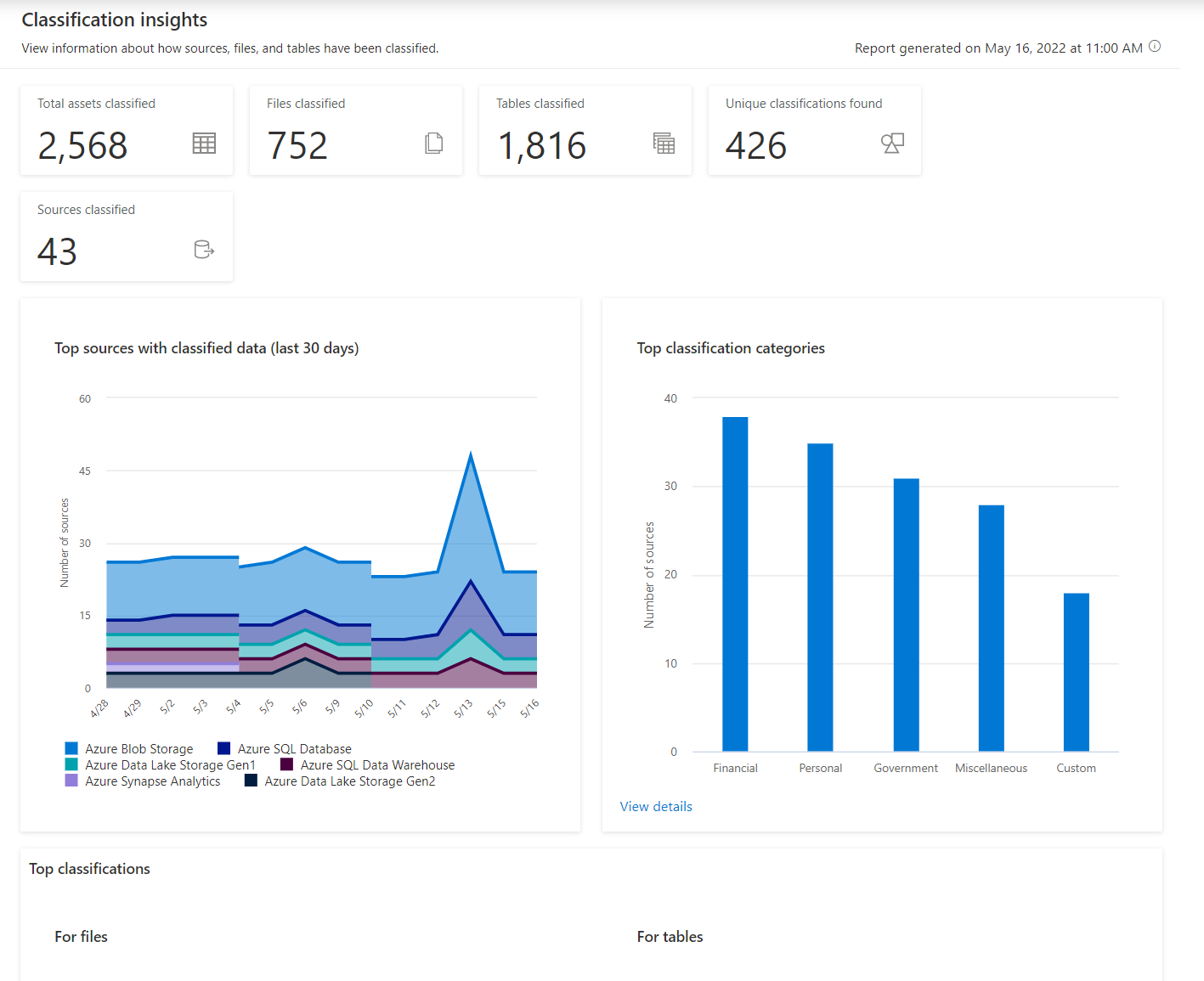 Questo report fornisce informazioni dettagliate sulla posizione dei dati classificati, sulle classificazioni rilevate durante un'analisi e su un drill-down per i file classificati stessi. Consente agli utenti incentrati sulla qualità dei dati e sulla sicurezza dei dati, ad esempio amministratori dei dati, curatori dei dati e amministratori della sicurezza, di comprendere i tipi di informazioni disponibili nel patrimonio dati dell'organizzazione.