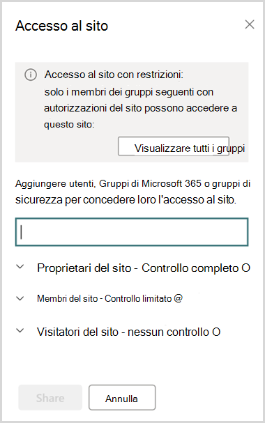 La condivisione di un sito e del relativo contenuto non è consentita per i gruppi di sicurezza annidati che fanno parte dei gruppi con restrizioni Controllo di accesso. Questo supporto verrà aggiunto nell'iterazione della versione successiva.