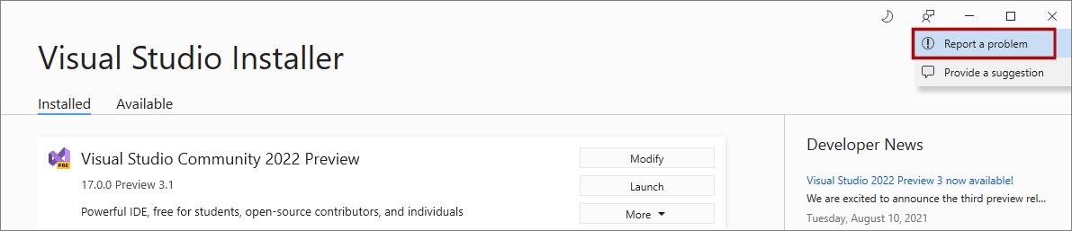 Aprire il programma di installazione di Visual Studio. Selezionare quindi Segnala un problema per aprire lo strumento Commenti e suggerimenti di Visual Studio.