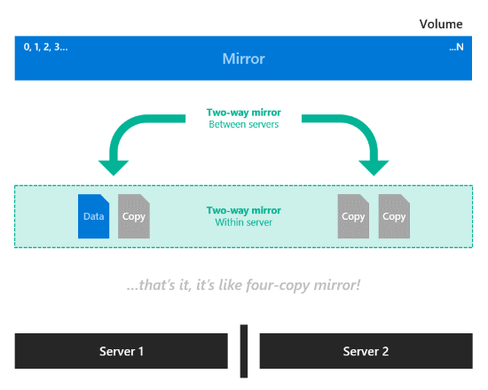 Specchio a due vie nidificato. All'interno di ogni server, la resilienza locale viene fornita dal mirroring bidirezionale e quindi un'ulteriore resilienza viene fornita dal mirroring bidirezionale tra i due server. Si tratta essenzialmente di un mirror a quattro vie, con due copie su ciascun server che si trovano su dischi fisici diversi. Il mirroring bidirezionale nidificato offre prestazioni senza compromessi: le scritture vengono eseguite su tutte le copie e le letture provengono da qualsiasi copia.