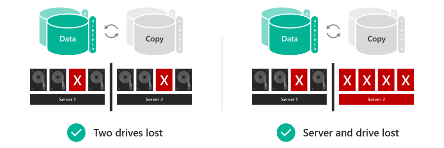 Spazi di archiviazione diretta in Azure locale e Windows Server offre due opzioni di resilienza implementate nel software, senza la necessità di hardware RAID specializzato: