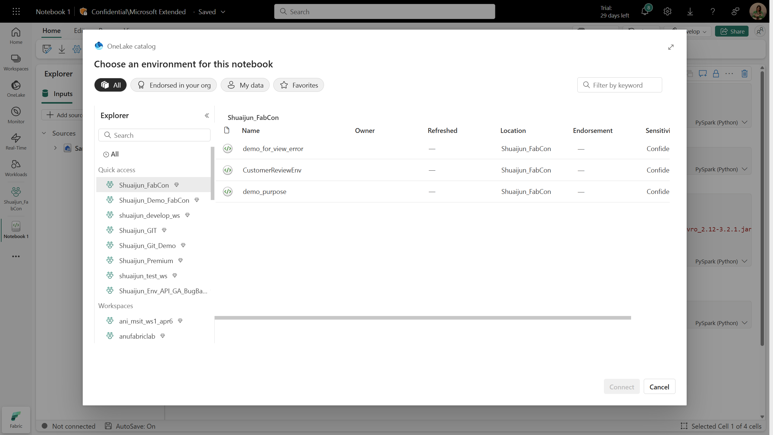 L'ambiente è disponibile sia nelle schede Notebook che Spark Job Definition. Quando i notebook e le definizioni dei processi Spark sono collegati a un ambiente, possono accedere alle librerie, alle configurazioni di calcolo e alle risorse. L'Explorer elenca tutti gli ambienti disponibili che sono condivisi con te, che provengono dall'area di lavoro corrente e che provengono da altre aree di lavoro a cui hai accesso.