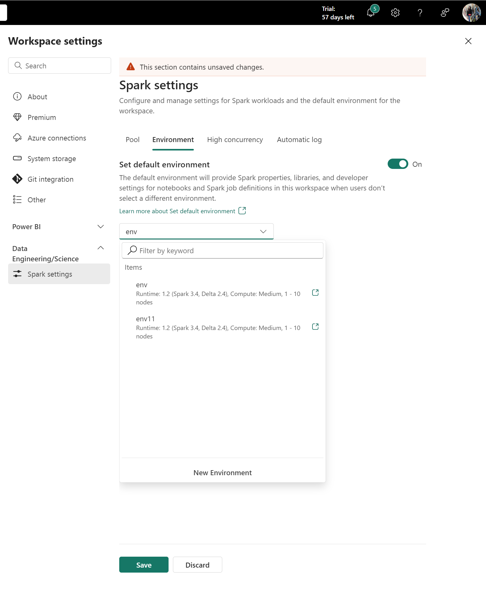 - Quando l'interruttore è Attivato, si seleziona l'elemento di ambiente come impostazione predefinita per l'area di lavoro. Notebook e definizioni di processi Spark che usano l'area di lavoro predefinita ereditano quindi le configurazioni di calcolo e libreria Spark dell'ambiente.