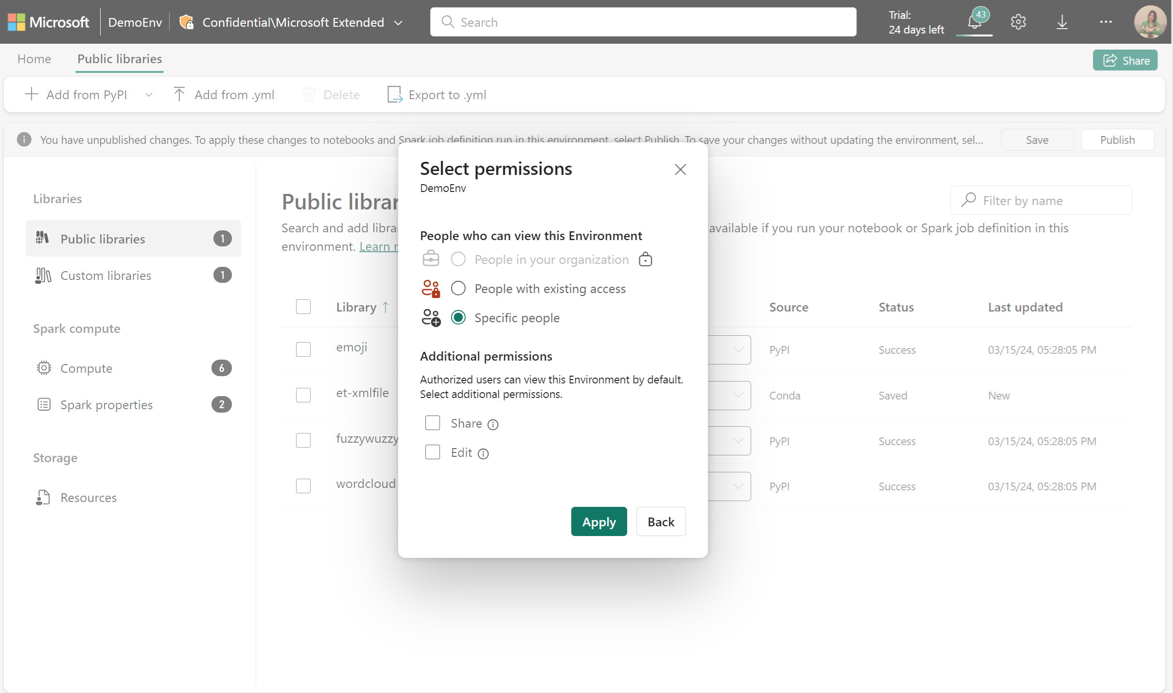- Pubblica applica le modifiche in sospeso alle librerie e alle risorse di calcolo Spark.
