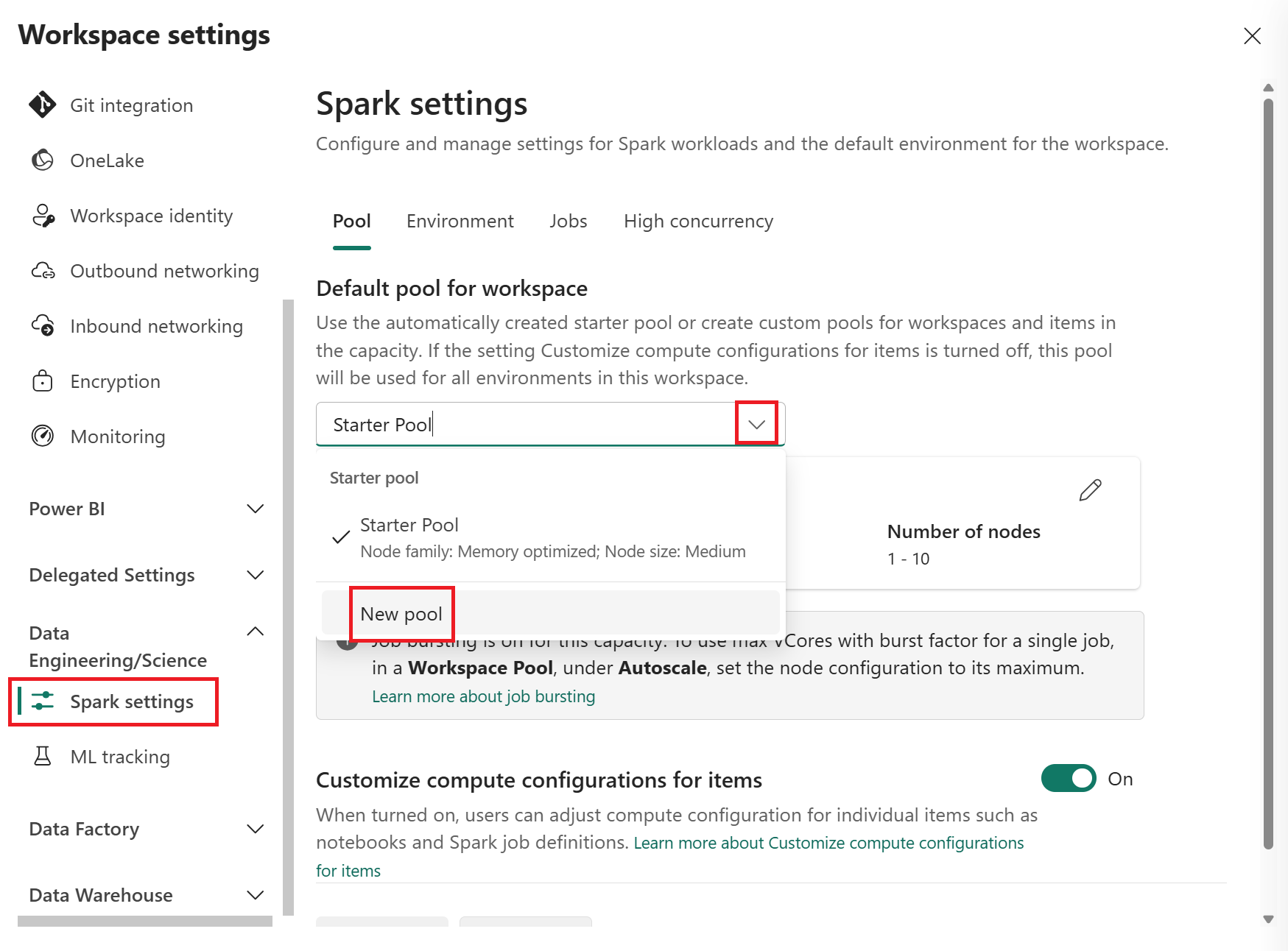 - Un amministratore delle risorse deve abilitare i pool personalizzati di aree di lavoro nelle impostazioni di Calcolo Spark per le risorse.