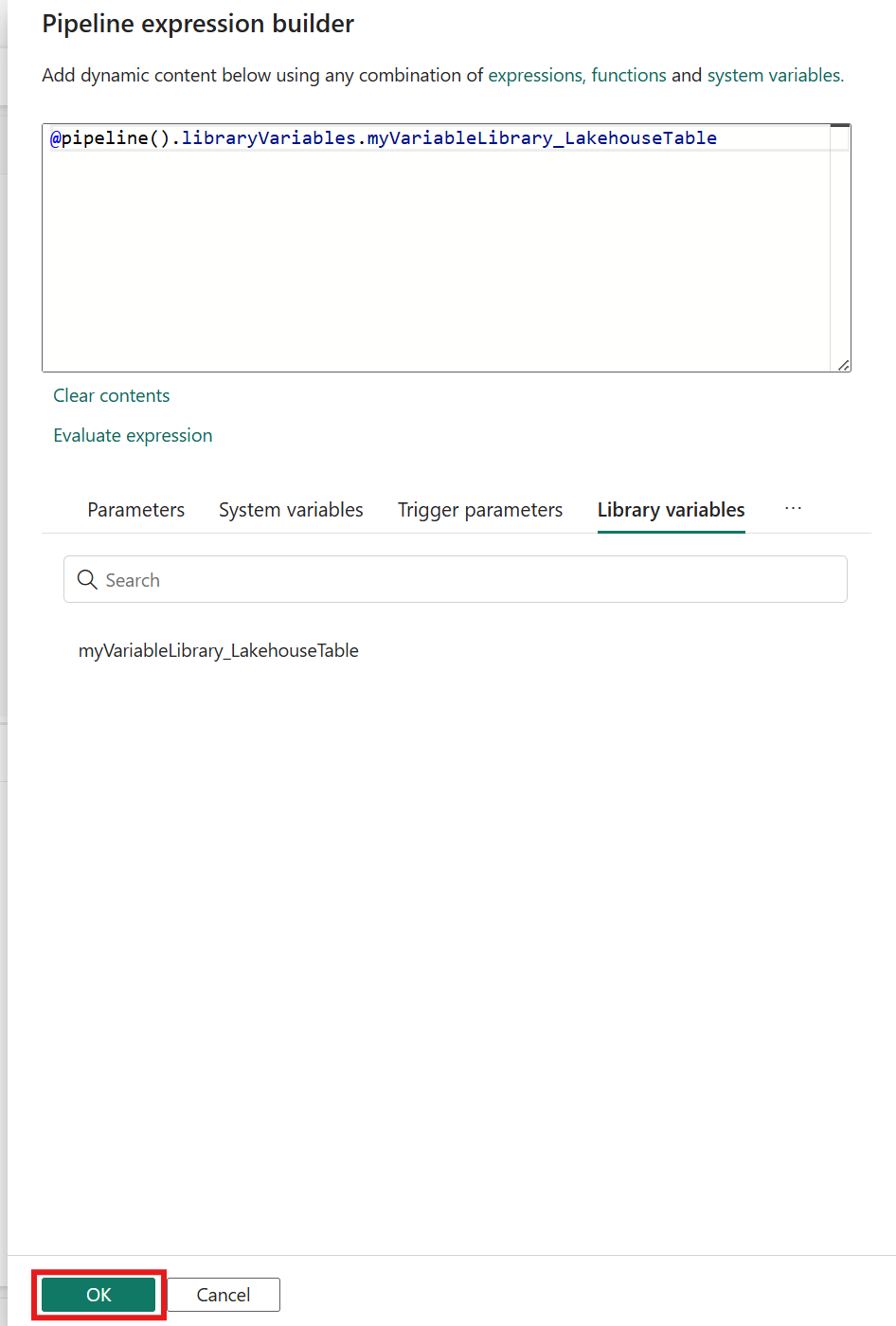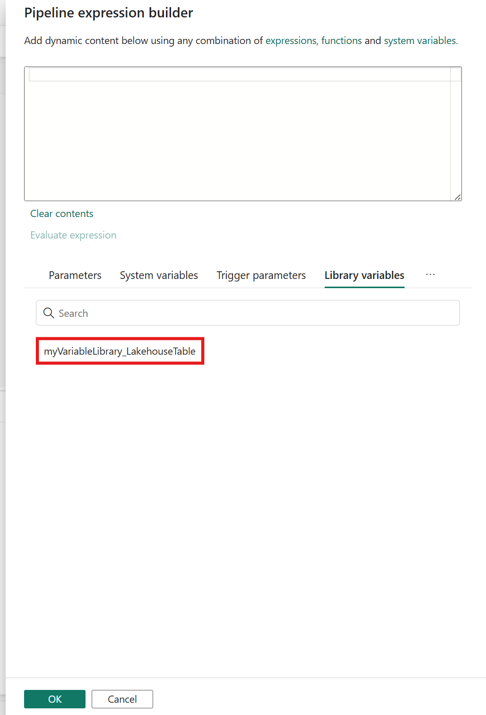 Selezionare il riferimento alla variabile Library per aggiungere una nuova espressione al generatore di espressioni. Selezionare quindi OK per aggiungere l'espressione.