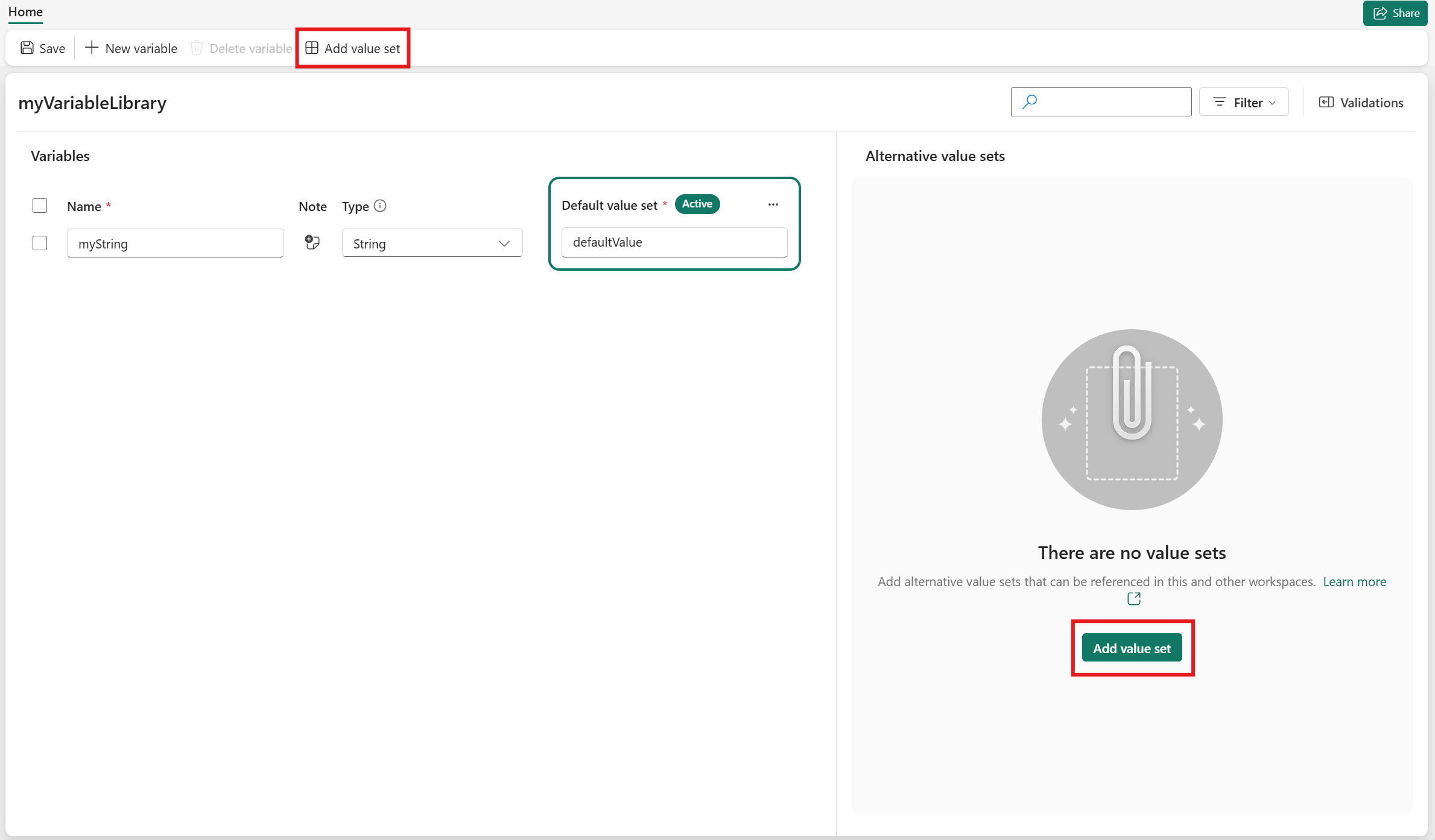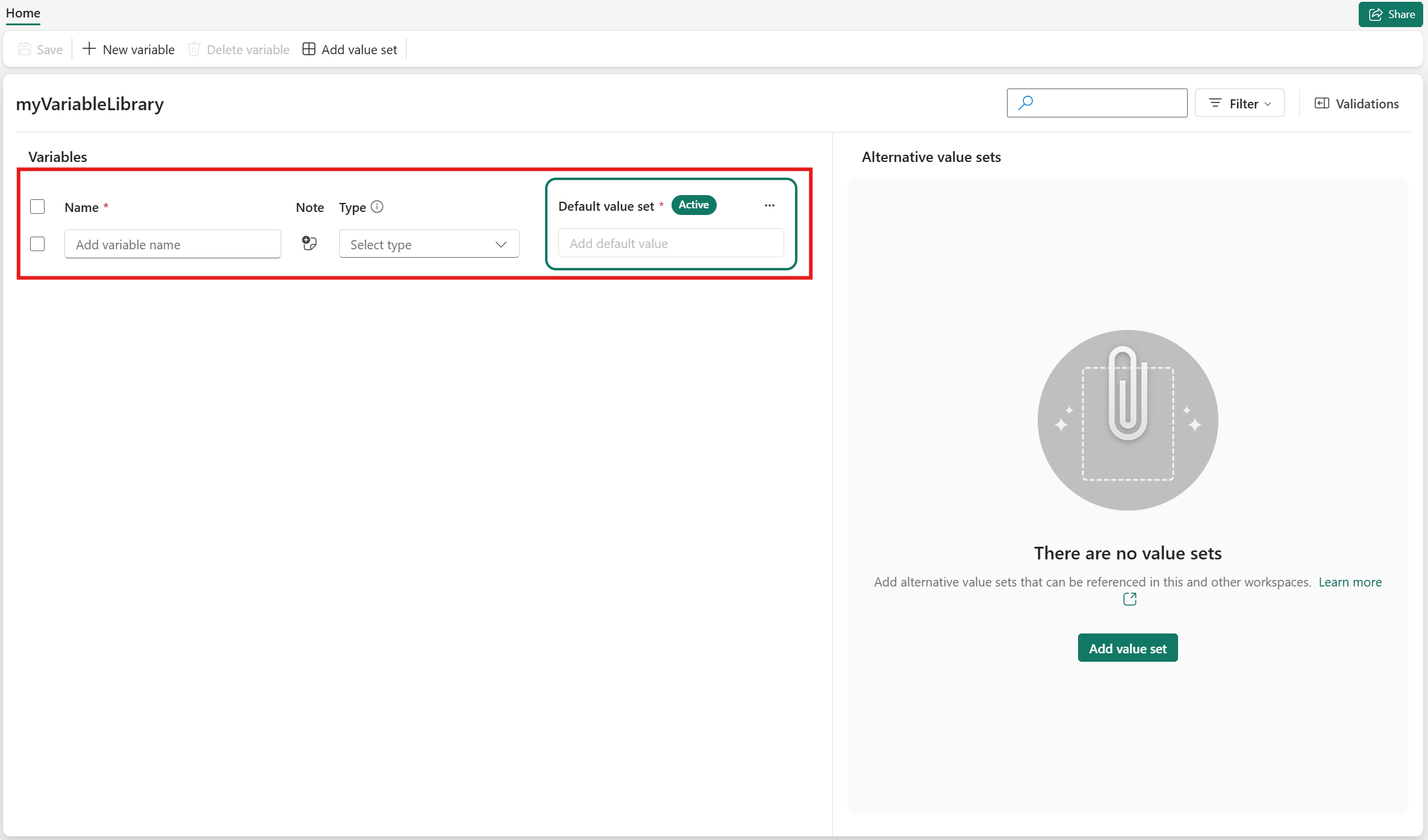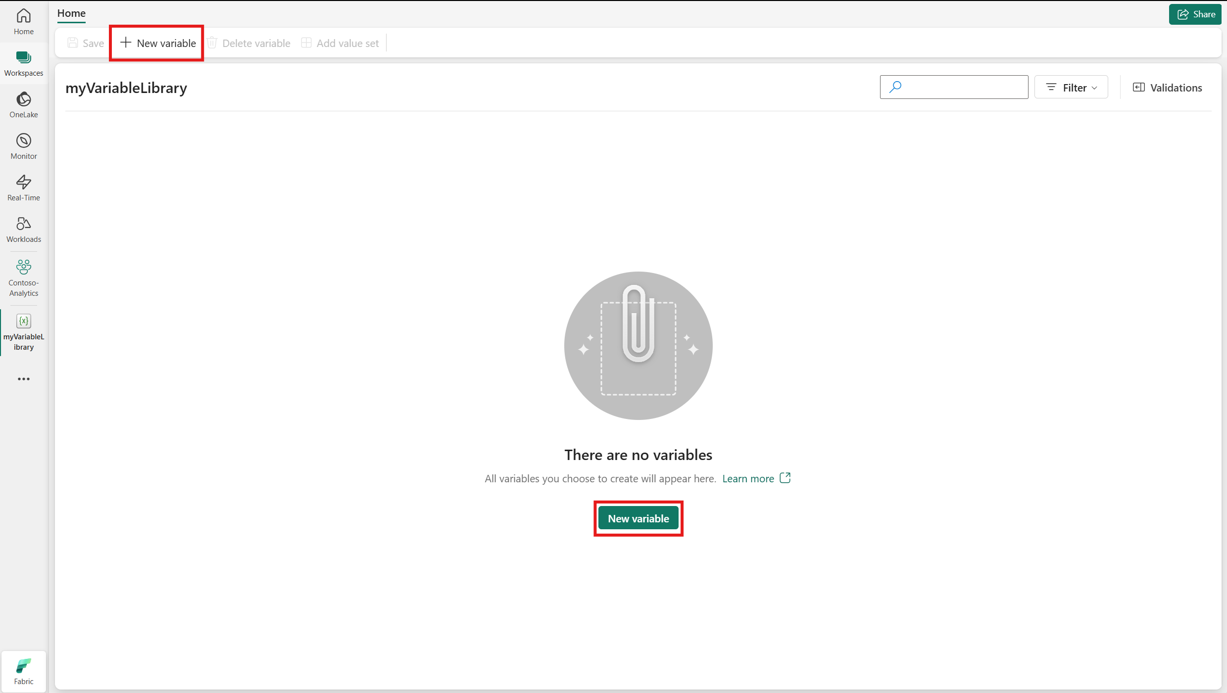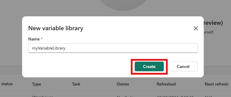 Selezionare Libreria di variabili per creare una nuova libreria di variabili. Immettere un nome e selezionare Crea.