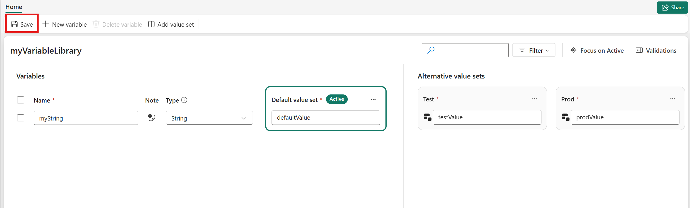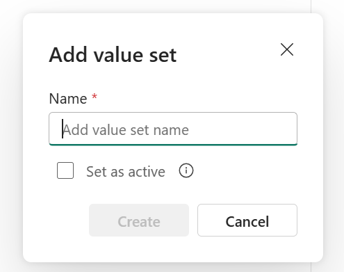 Aggiungere set di valori alternativi in base alle esigenze, ad esempio valori diversi per ambienti della pipeline di distribuzione diversi. Dopo aver impostato un nome e aver selezionato Crea, è possibile modificare i valori delle variabili e scegliere il valore impostato per rendere attivo.