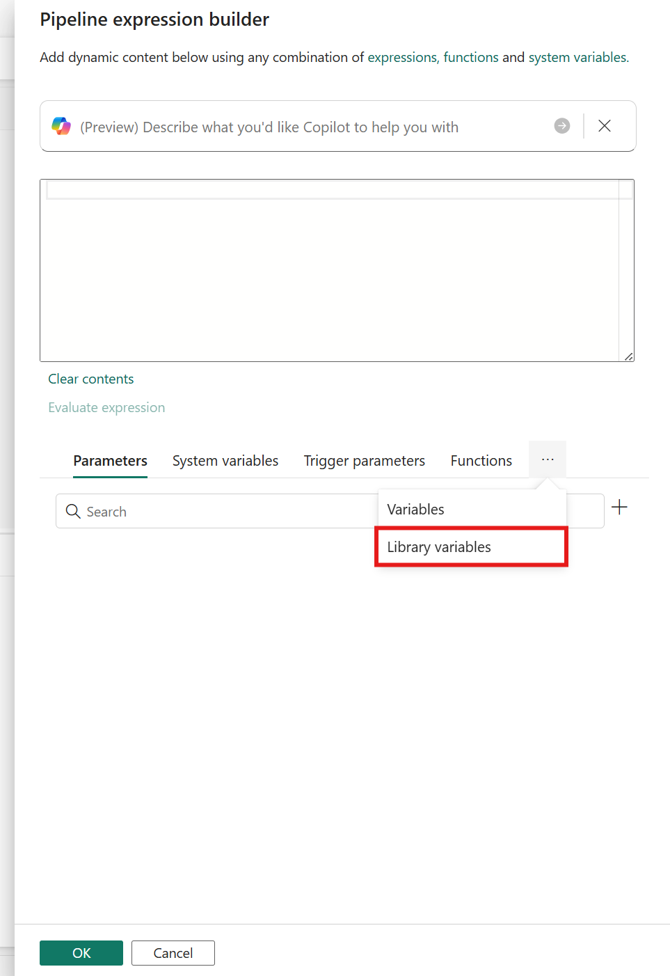 Verrà aperto il generatore di espressioni. Se non vengono visualizzate variabili di libreria, selezionare i tre puntini accanto a Funzioni e selezionare Variabili di libreria.