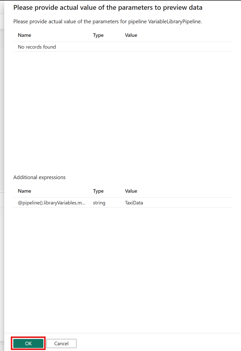 È possibile visualizzare in anteprima i dati selezionando Anteprima dati. Questa azione apre un nuovo riquadro che mostra il valore della variabile di libreria. Selezionare OK per ottenere un'anteprima dei dati.