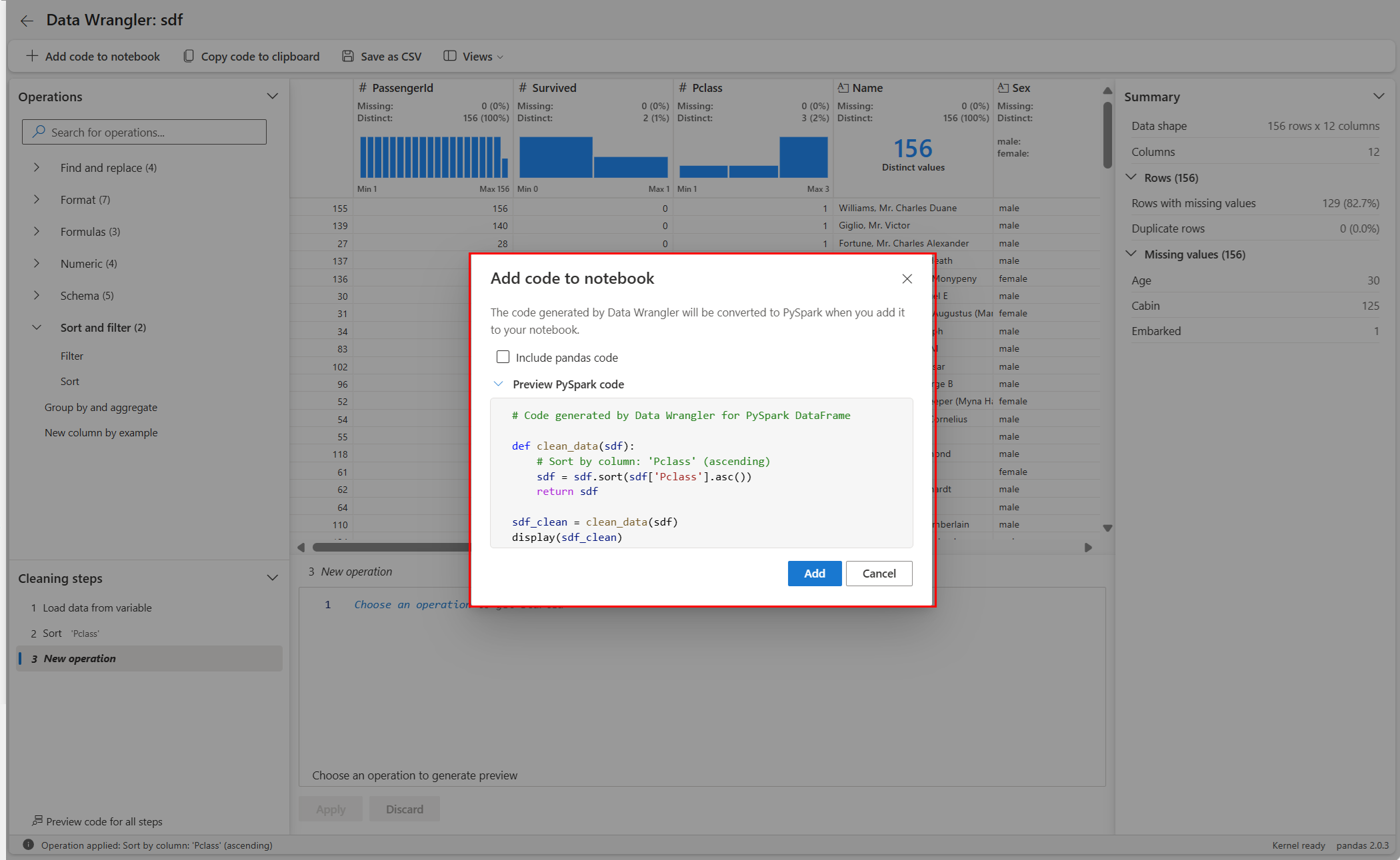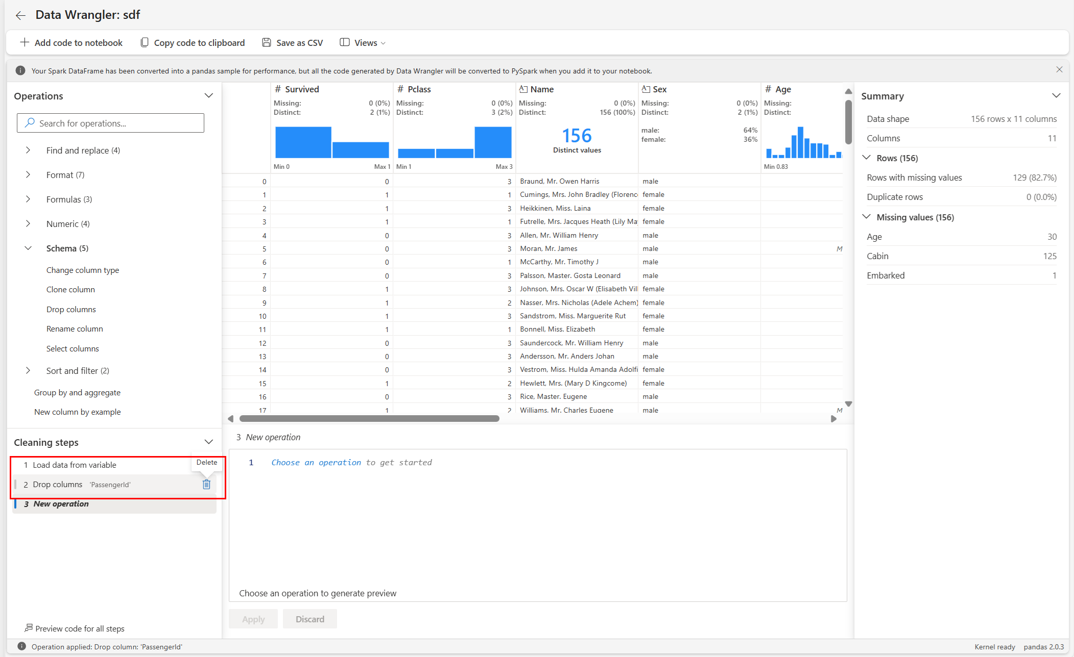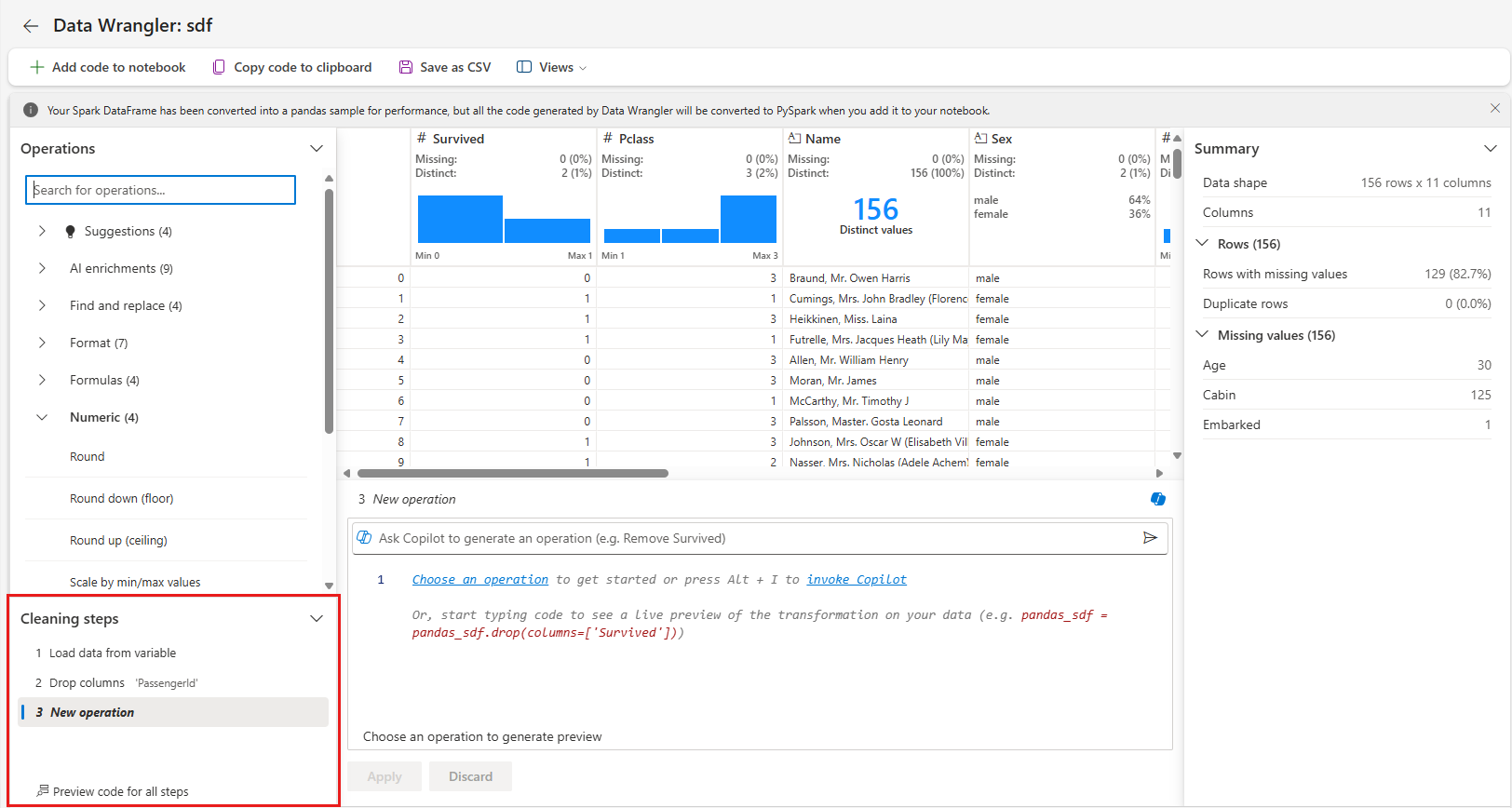 Data Wrangler genera codice che viene applicato solo quando si esegue manualmente la nuova cella e non sovrascriverà il tuo DataFrame originale, come illustrato in questo screenshot: