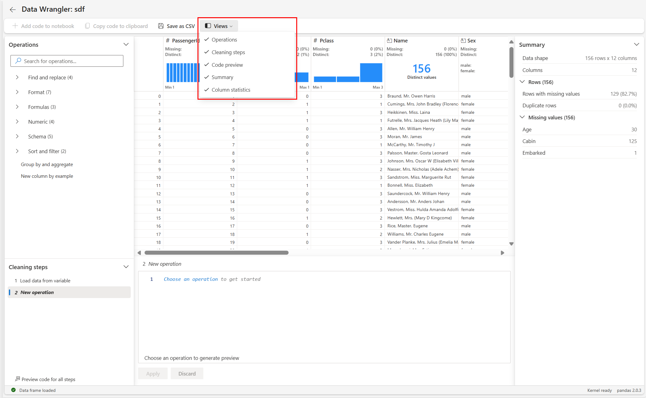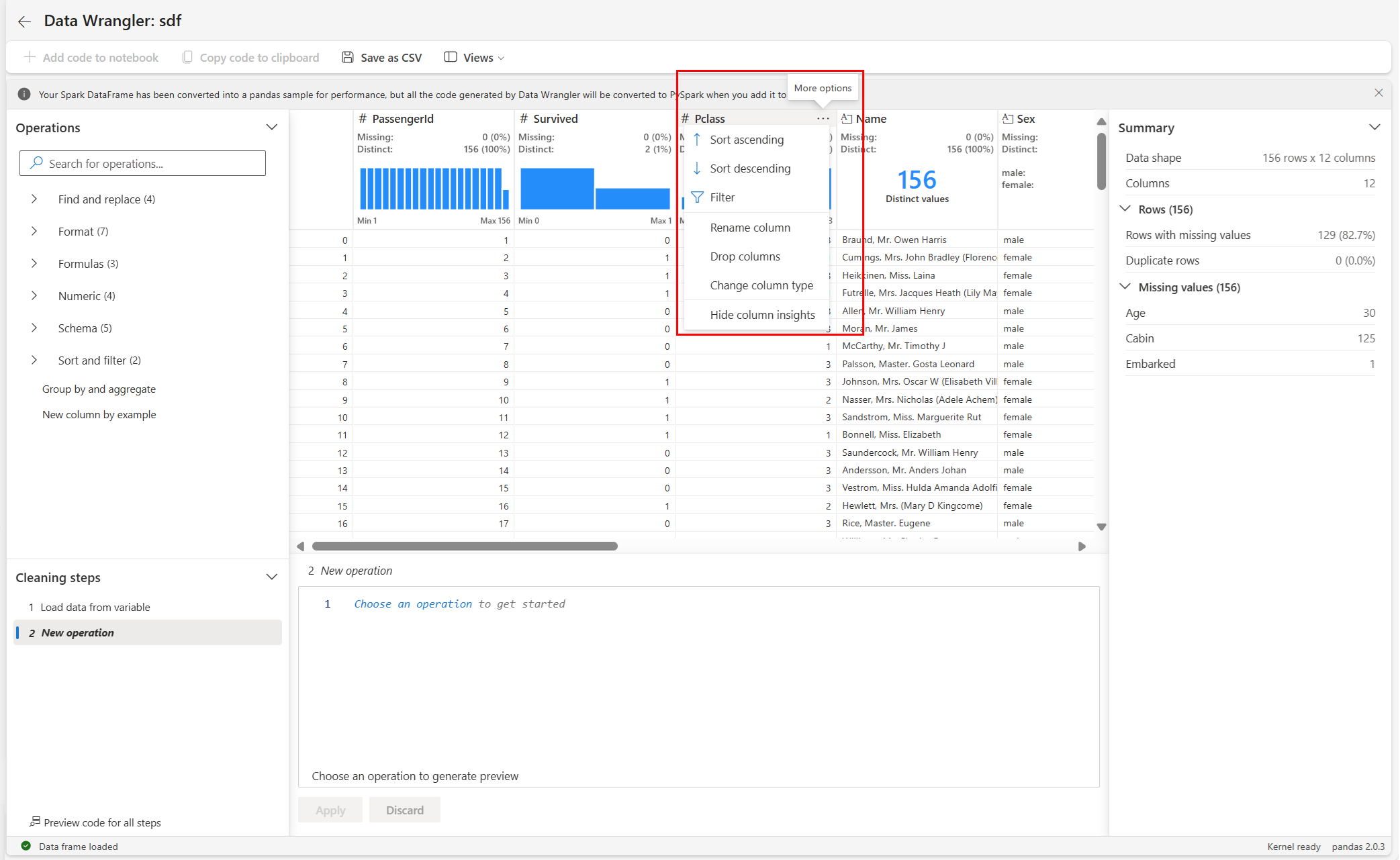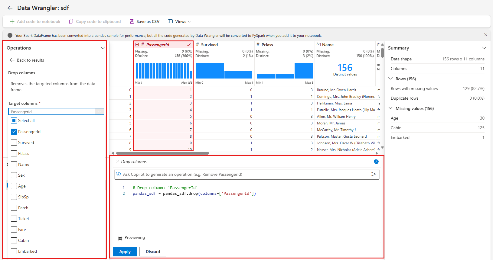 Data Wrangler genera codice che viene applicato solo quando si esegue manualmente la nuova cella e non sovrascriverà il tuo DataFrame originale, come illustrato in questo screenshot: