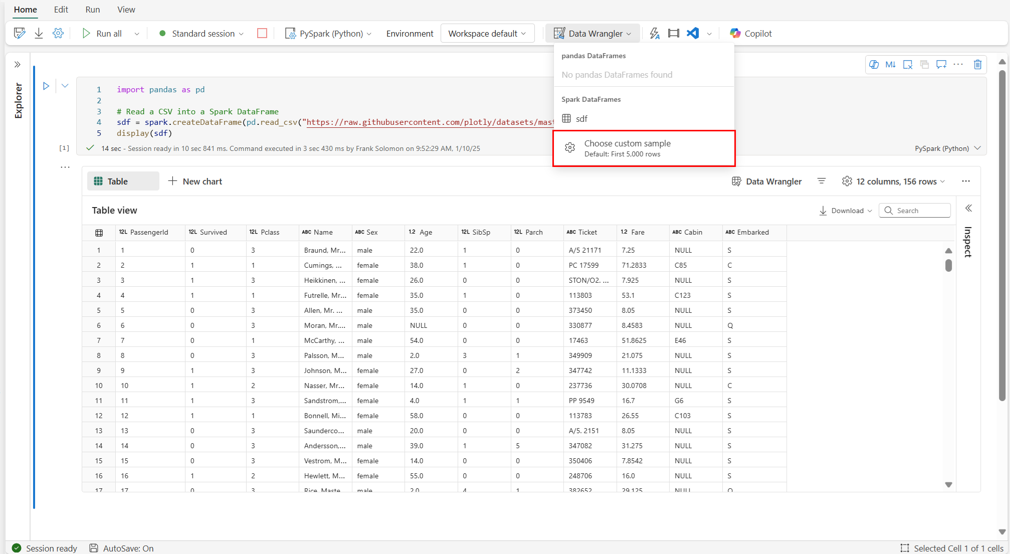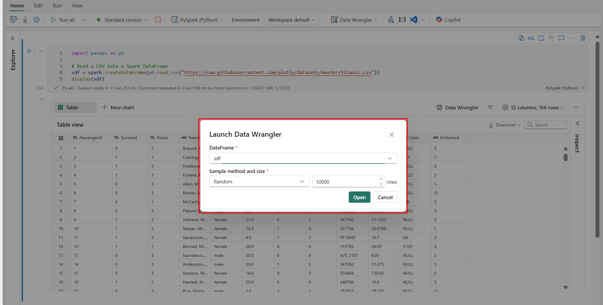 Avvio di Data Wrangler con un dataframe Spark