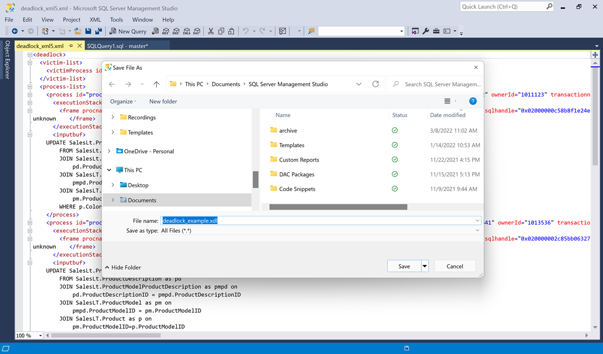 È possibile lasciare in esecuzione una sessione XEvents che raccoglie informazioni sui deadlock nei database critici durante lunghi periodi. Se si utilizza una destinazione di file di eventi, ciò potrebbe comportare file di grandi dimensioni se si verificano più deadlock. È possibile eliminare i file BLOB dall’archiviazione di Azure per una traccia attiva, ad eccezione del file che si sta scrivendo.