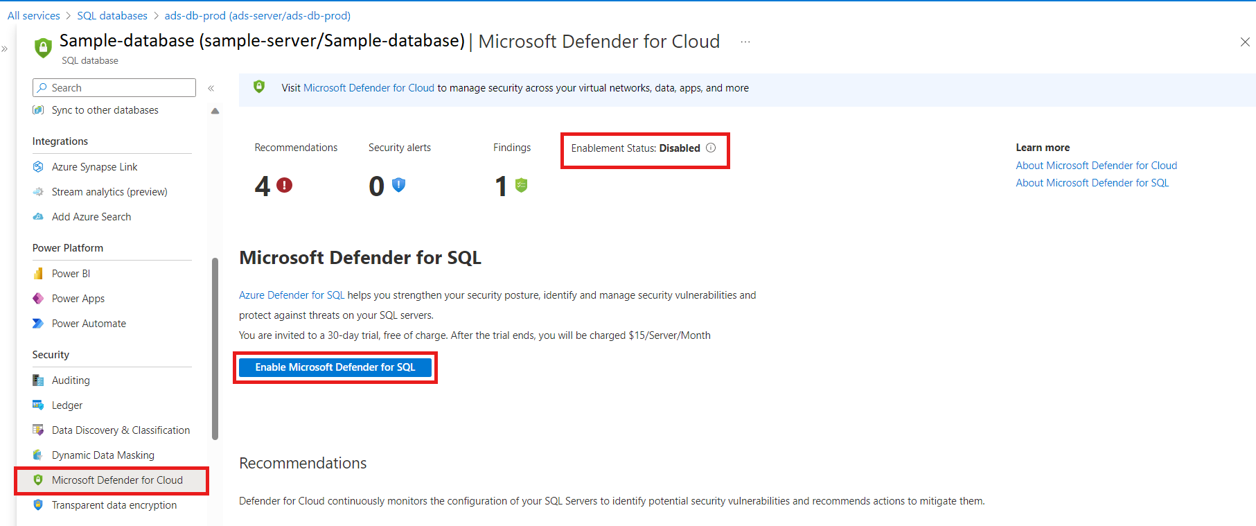 Selezionare Abilita Microsoft Defender per SQL.