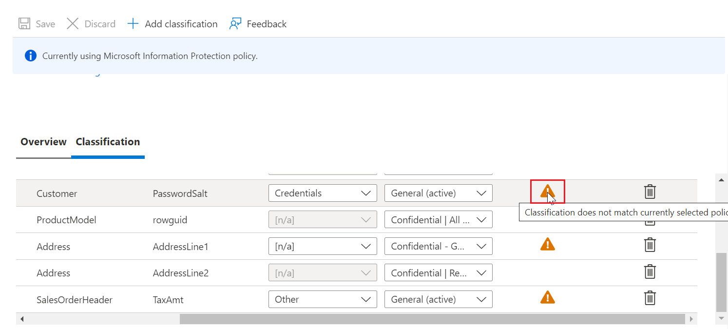 [n/a]mentre si è in modalità Criteri MIP e l'individuazione automatica dei dati e le raccomandazioni rimangono disabilitate.Un'icona di avviso può essere visualizzata su una colonna già classificata se la colonna è stata classificata usando criteri di Information Protection diversi rispetto a quelli attualmente attivi, ad esempio se la colonna è stata classificata con un'etichetta usando i criteri di SQL Information Protection in precedenza e ora si è in modalità criteri di Microsoft Information Protection. Verrà visualizzata un'icona di avviso per quella colonna specifica. L’icona di avviso non indica alcun problema, ma viene usata solo a scopo informativo.