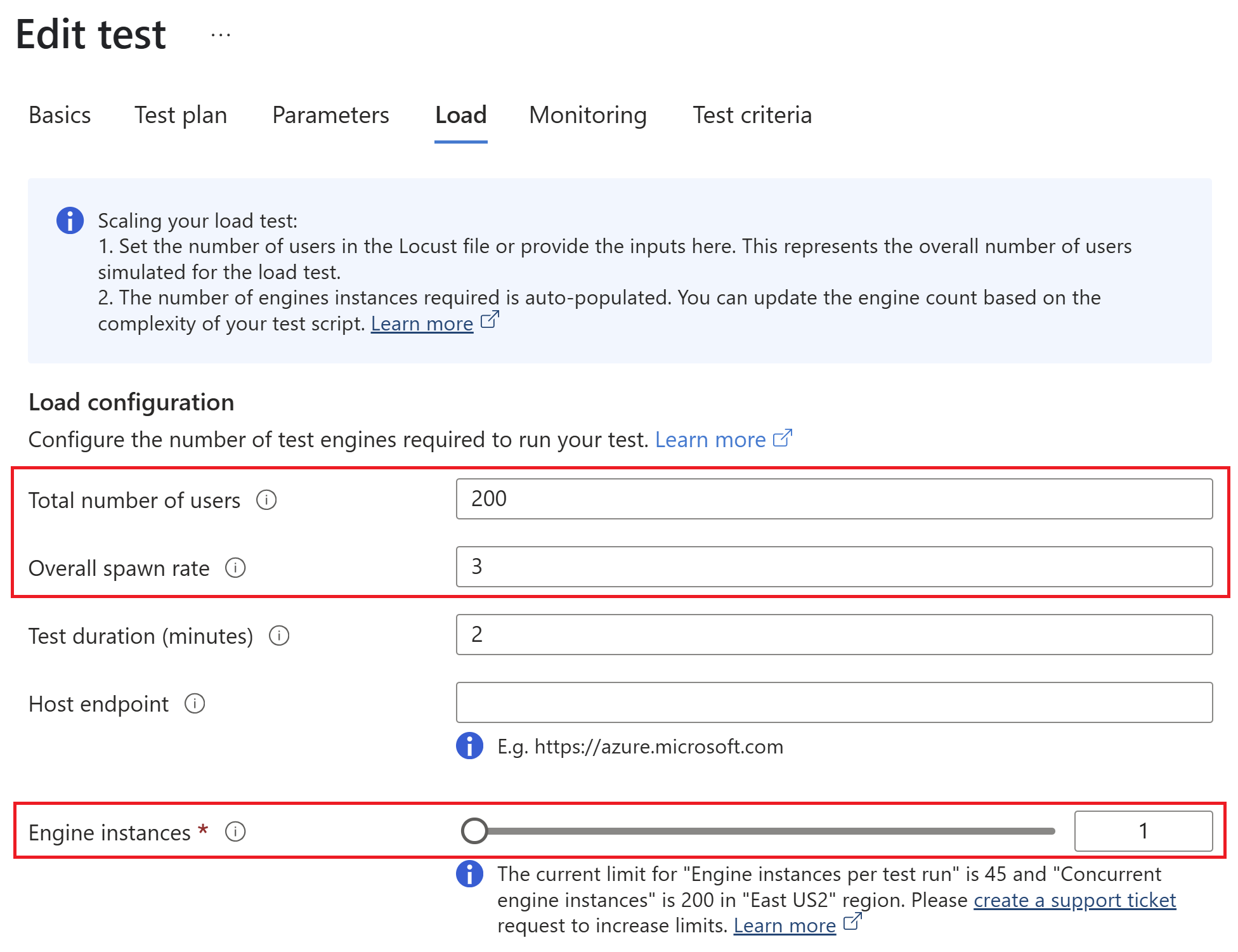 Ad esempio, per simulare 2.000 utenti, impostare il numero totale di utenti nella configurazione di caricamento su 2.000. Test di carico di Azure popola automaticamente il numero di motori come 4. Aggiornare il numero di motori, se necessario. Se gli utenti sono stati configurati nello script di test o nel file di configurazione Locust come 2.000, impostare le istanze del motore su 4 nella configurazione di caricamento.
