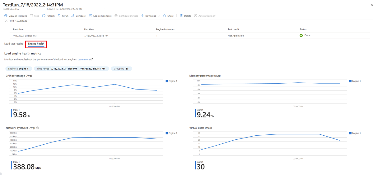 Nella dashboard di esecuzione dei test selezionare Integrità motore per visualizzare le metriche delle risorse del motore.