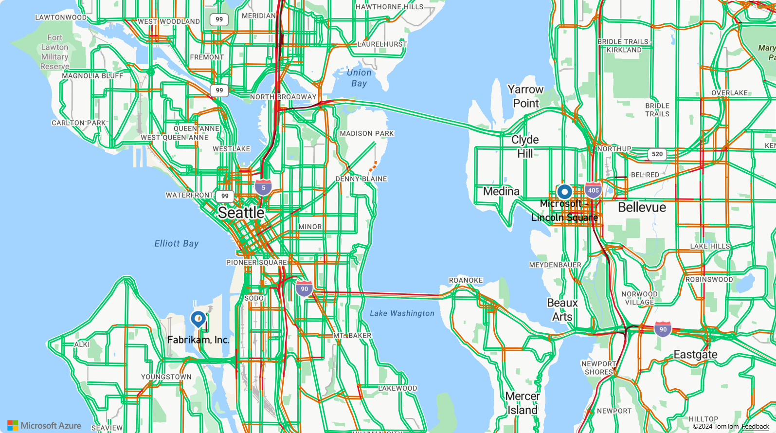 readydel controllo mappa aggiungere il codice seguente.//Create the GeoJSON objects which represent the start and end point of the route. var startPoint = new atlas.data.Feature(new atlas.data.Point([-122.356099, 47.580045]), { title: 'Fabrikam, Inc.', icon: 'pin-blue' }); var endPoint = new atlas.data.Feature(new atlas.data.Point([-122.201164, 47.616940]), { title: 'Microsoft - Lincoln Square', icon: 'pin-round-blue' }); //Add the data to the data source. datasource.add([startPoint, endPoint]); //Fit the map window to the bounding box defined by the start and end positions. map.setCamera({ bounds: atlas.data.BoundingBox.fromData([startPoint, endPoint]), padding: 100 });Informazioni sul codice JavaScript: