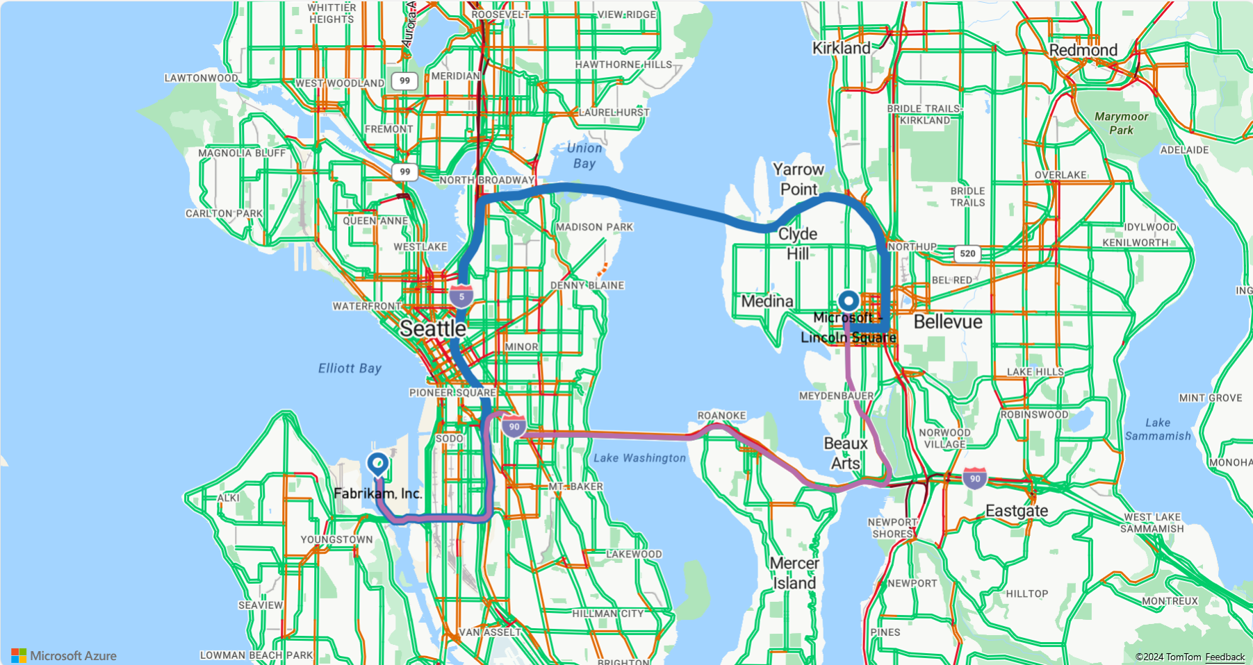 Salvare il file TruckRoute.html e aggiornare il browser. La mappa è ora centrata sulla città di Seattle. Il segnaposto blu a goccia contrassegna il punto di partenza. L'indicatore rotondo a goccia contrassegna il punto di arrivo.