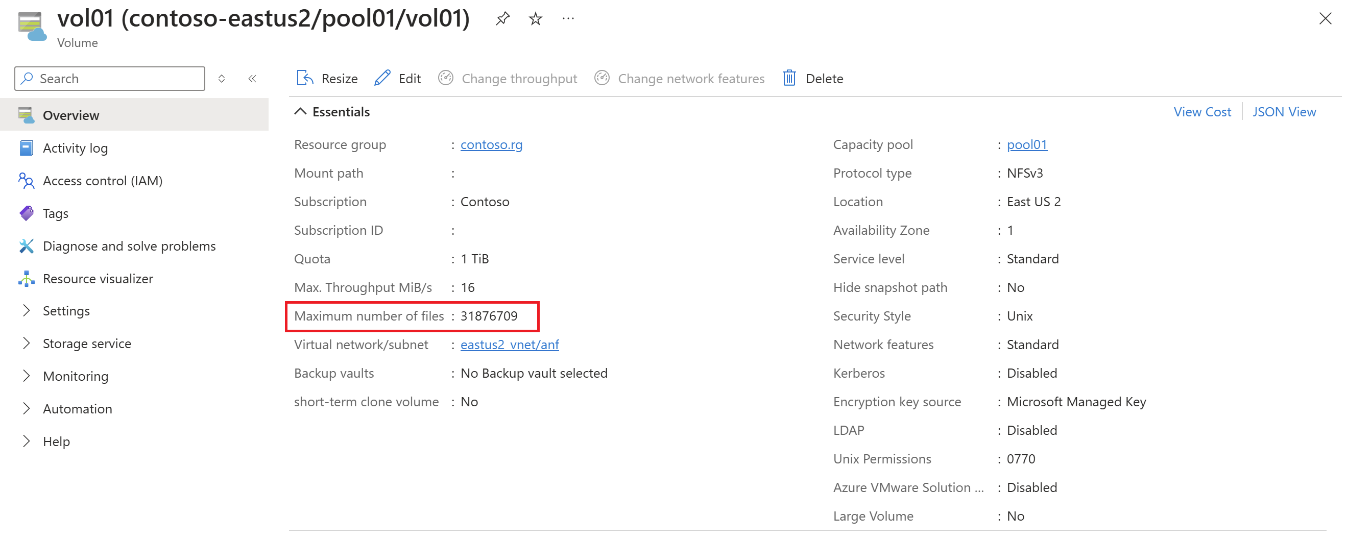 Per visualizzare l'allocazione del valore maxfiles per specifiche dimensioni di volume, controllare il campo Numero massimo di file nel riquadro di panoramica del volume. È anche possibile visualizzare le metriche relative a maxfiles disponibili e consumate in Azure Monitor.
