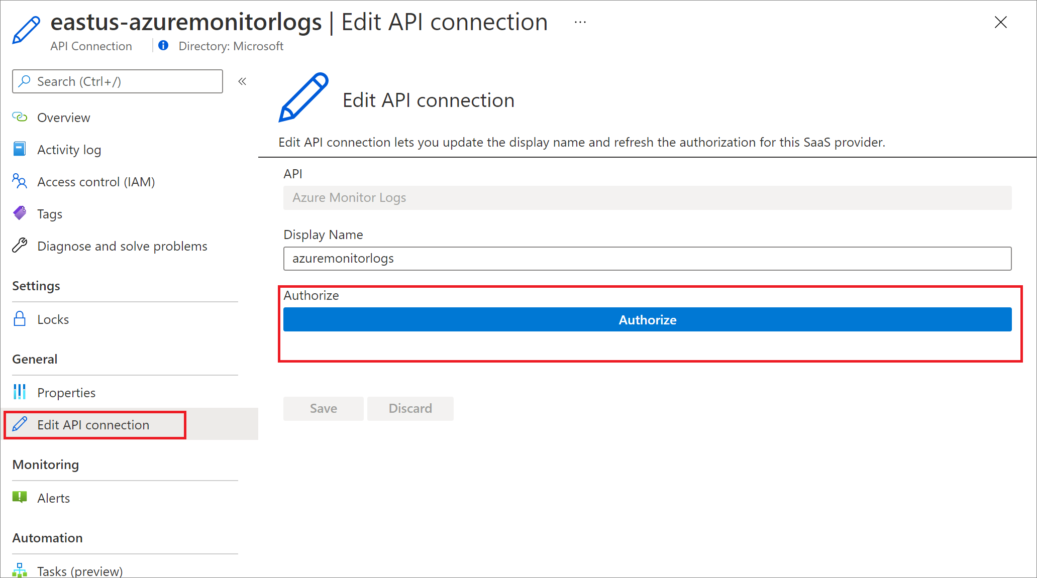<location>-azuremonitorlogse<location>-office365, ovvero eastus-azuremonitorlogs e eastus-office365.Passare a ognuna di queste connessioni e selezionare la voce di menu Modifica connessione API. Nella schermata visualizzata selezionare Autorizza e salvare la connessione al termine dell'autorizzazione.