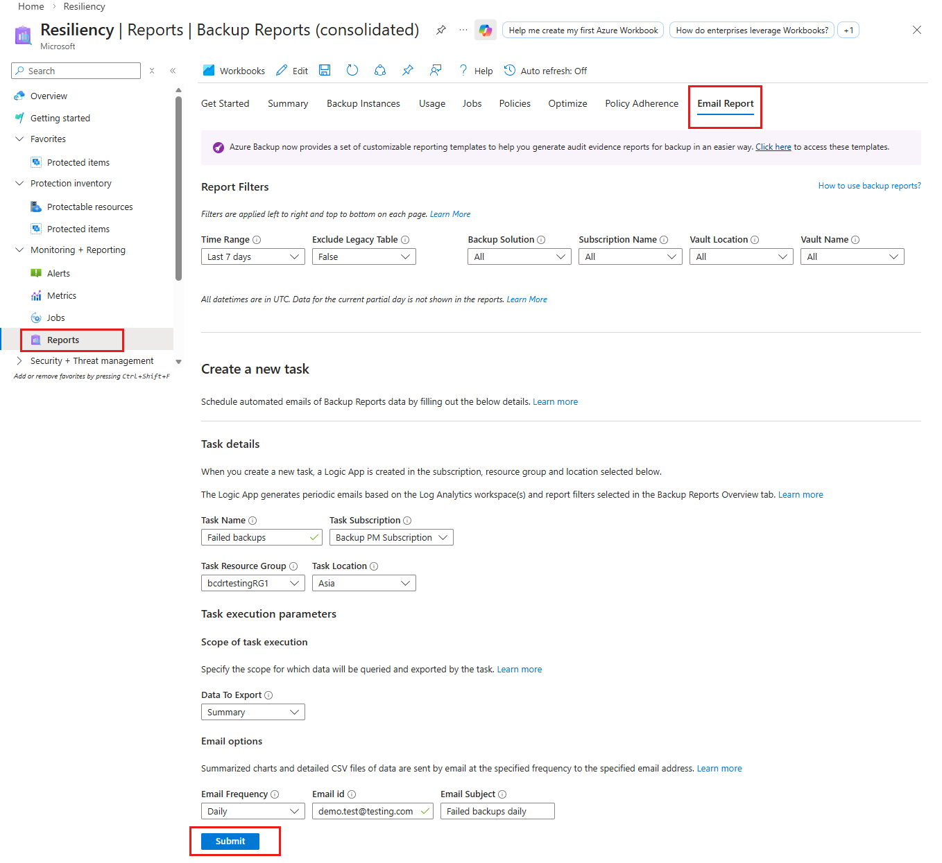 La funzionalità Report tramite posta elettronica disponibile per i report di backup permette di creare attività automatizzate per ricevere report periodici tramite posta elettronica. Questa funzionalità distribuisce un'app per la logica nell'ambiente di Azure che esegue query sui dati dalle aree di lavoro Log Analytics (LA) selezionate, in base agli input forniti. Altre informazioni sulle app per la logica e sui relativi prezzi.