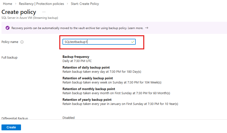 Passare a Resilienza e quindi selezionare Gestisci> criteri >+ Crea criterio>di backup.