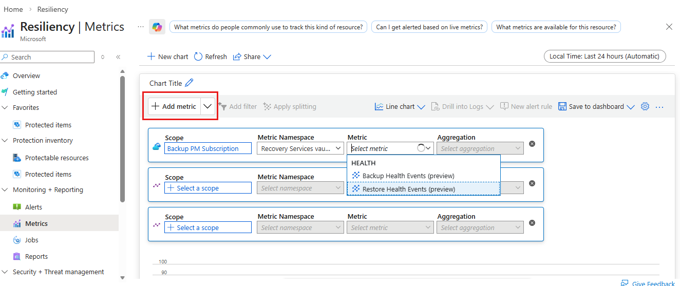 - Se si passa a Metriche dall'insieme di credenziali di Servizi di ripristino/ Insieme di credenziali di Backup, l'ambito della metrica è pre-selezionato.