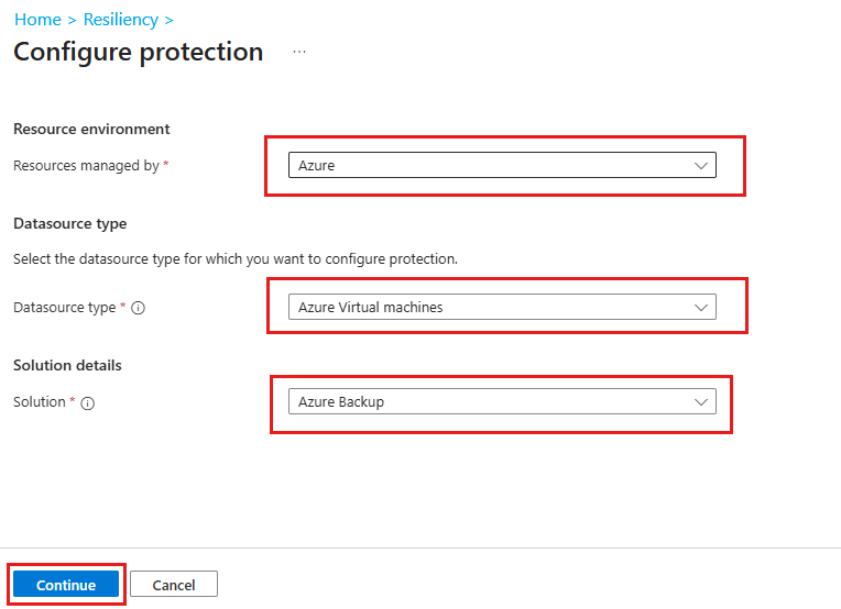 Nel riquadro Configurare la protezione selezionare Risorsa gestita da come AzureDatasource type as Azure Virtual machines, Solution as Azure Backup, quindi selezionare Continue.