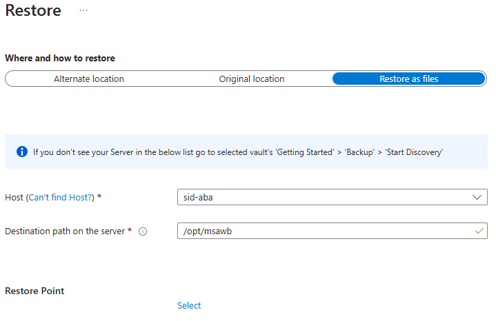 Per ripristinare i dati di backup come file anziché come database, selezionare Ripristina come file. Dopo aver eseguito il dump dei file in un percorso specificato, è possibile portarli in qualsiasi computer DELL'ambiente del servizio app SAP in cui si desidera ripristinarli come database. Poiché è possibile spostare i file in qualsiasi computer, è ora possibile ripristinare i dati tra sottoscrizioni e aree.