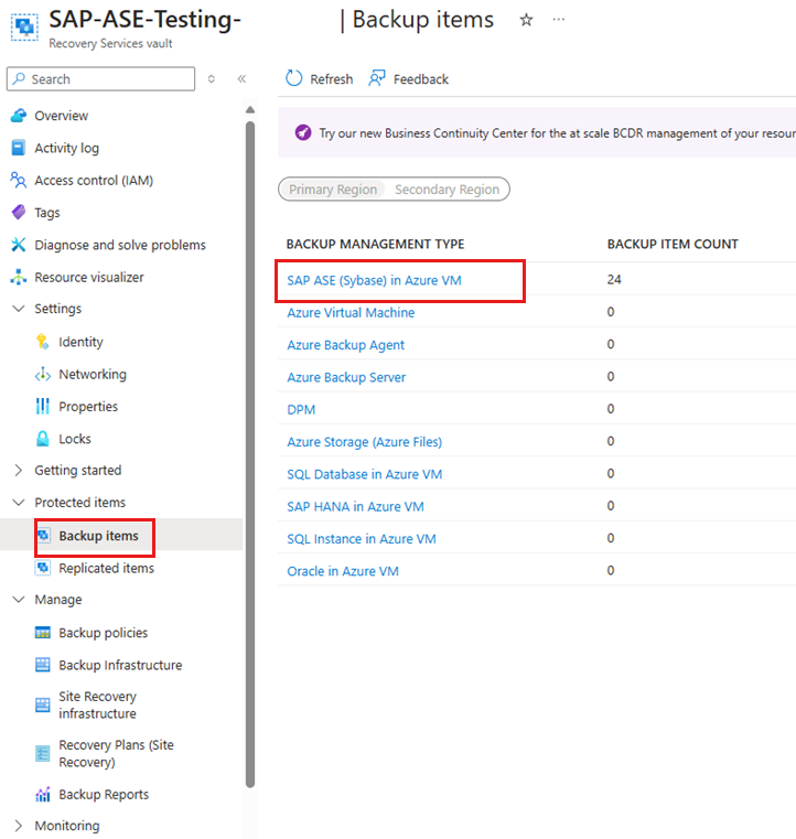 Vai alla cassetta dei Servizi di ripristino, quindi seleziona Elementi di backup>SAP ASE (Sybase) nella macchina virtuale di Azure sotto Tipo di gestione backup.