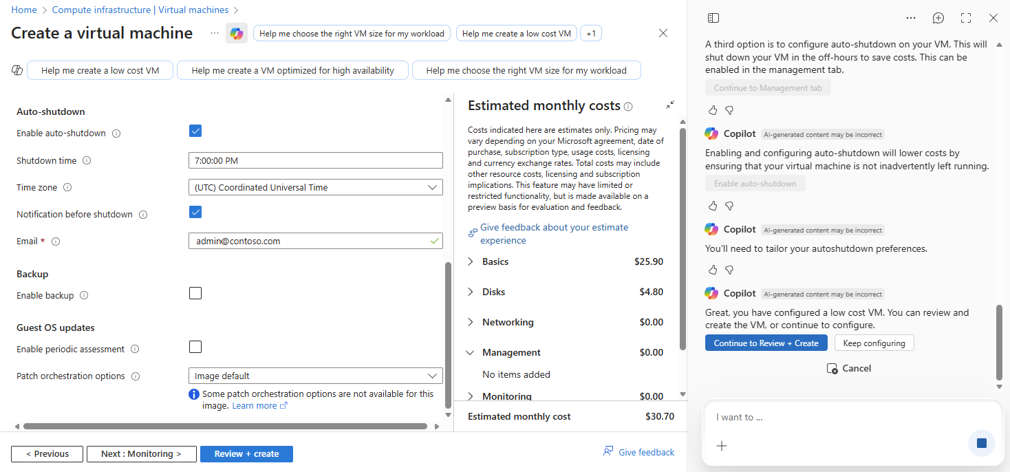 Dopo aver completato le opzioni suggerite da Azure Copilot, è possibile esaminare e creare la macchina virtuale con le raccomandazioni fornite o continuare a apportare altre modifiche. Il riquadro Costo mensile stimato mostra gli aggiornamenti in base alla configurazione.