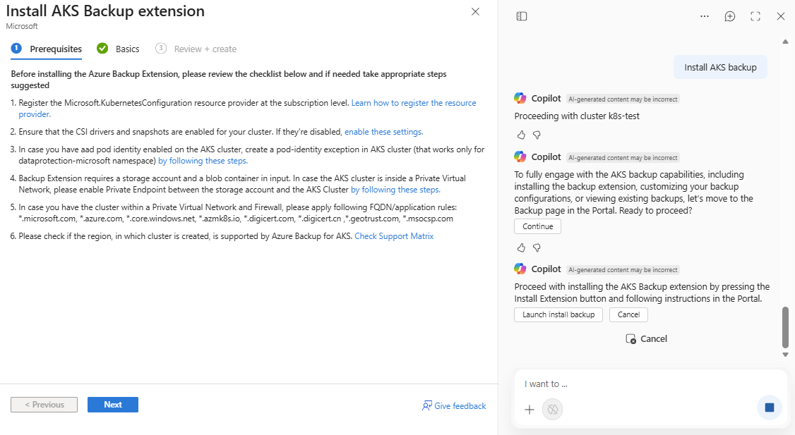 Azure Copilot consente di semplificare il processo di installazione dell'estensione Backup di Azure in un cluster del servizio Azure Kubernetes. Nei cluster in cui l'estensione è già installata, consente di configurare i backup e visualizzare i backup esistenti.