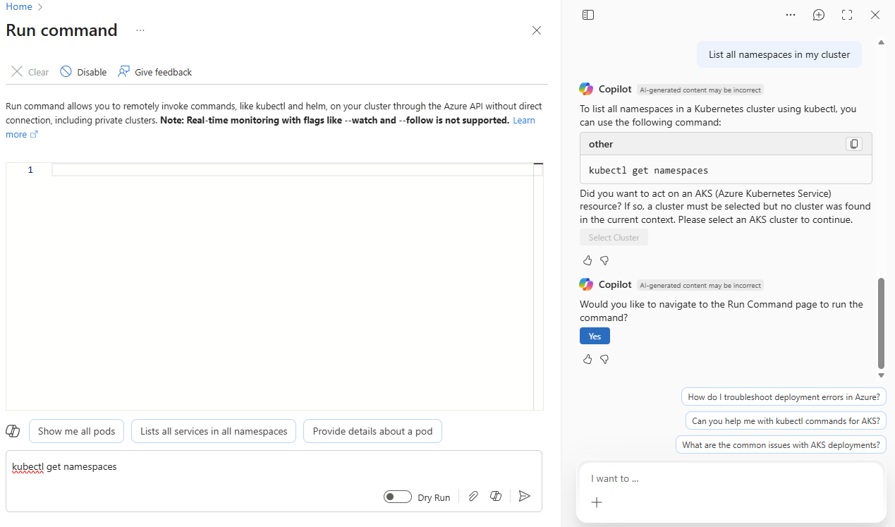 È possibile dire "Elenca tutti gli spazi dei nomi nel cluster".Azure Copilot mostra il comando kubectl per eseguire la richiesta e chiedere se si desidera eseguire il comando. Se non si lavora già nel contesto di un cluster, viene richiesto di selezionare uno. Quando si conferma, viene aperto il riquadro Esegui comando con il comando generato incluso.