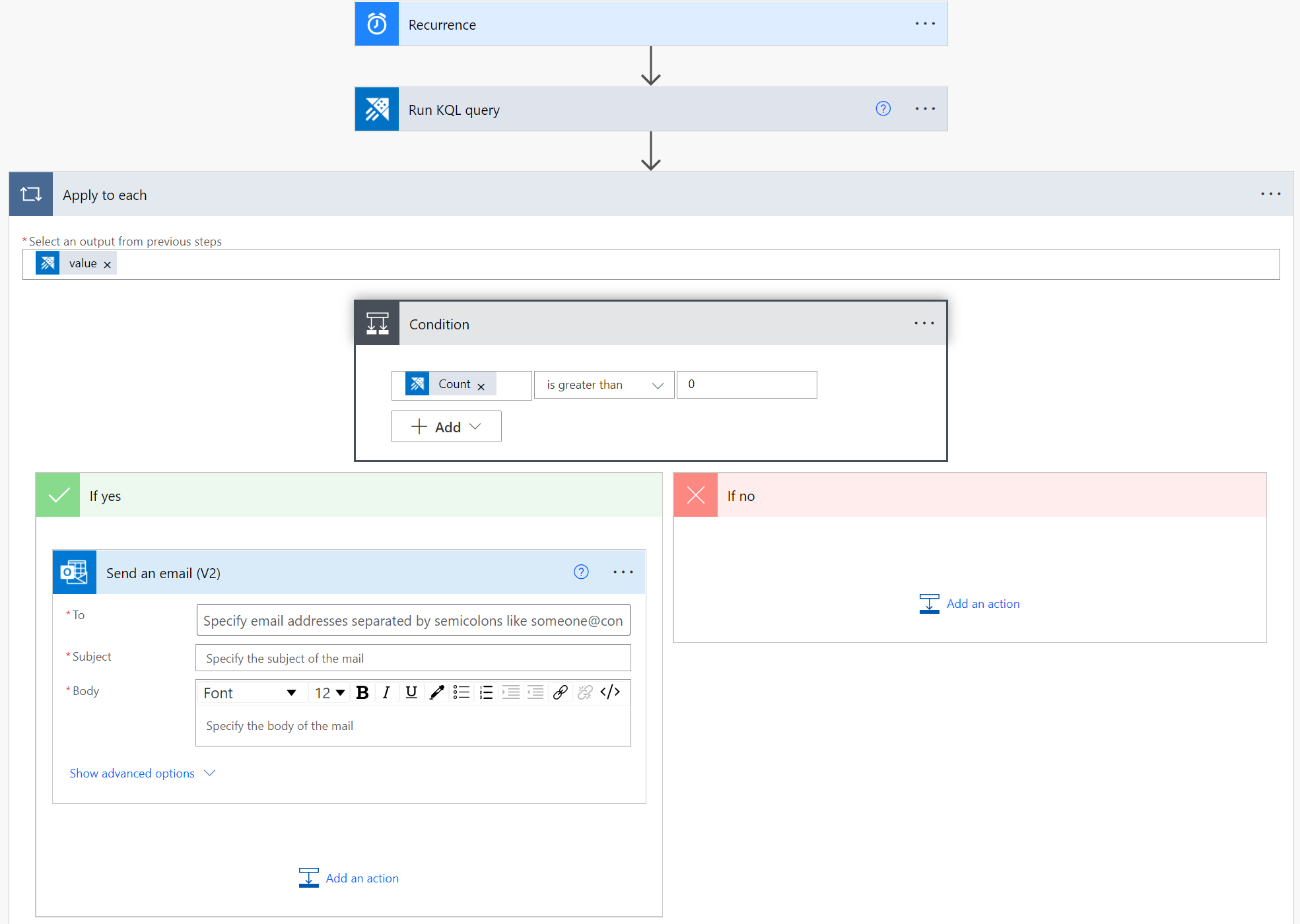 Usare questa azione per visualizzare un risultato della query KQL come tabella o grafico. Ad esempio, usare questo flusso per ricevere report giornalieri tramite posta elettronica.