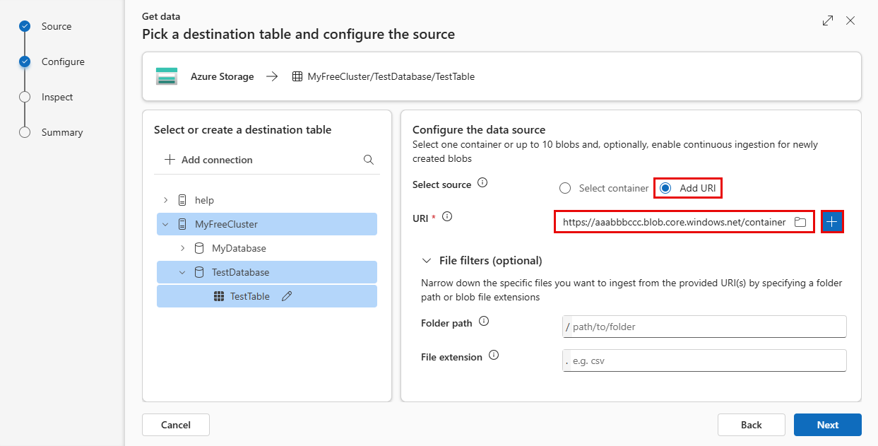Incollare l'URL nel campo URI e quindi selezionare il pulsante più (+). È possibile aggiungere più URI per singoli BLOB o un singolo URI per un contenitore.