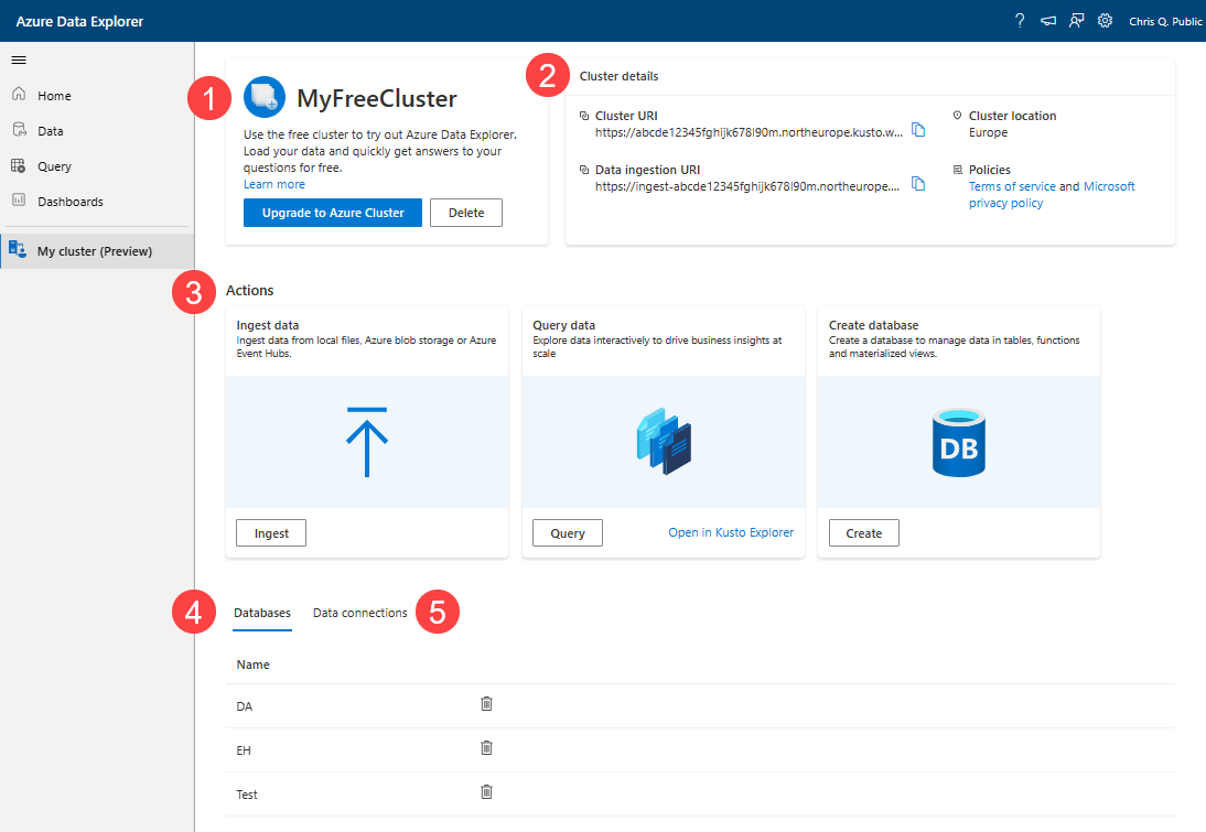 Impostazione Valore suggerito Descrizione Nome visualizzato del cluster MyFreeCluster Nome visualizzato per il cluster. Un nome cluster univoco verrà generato come parte della distribuzione e il nome di dominio [region].kusto.windows.net viene aggiunto. Nome database MyDatabase Nome del database da creare. Il nome deve essere univoco all'interno del cluster. Seleziona percorso Europa Percorso in cui verrà creato il cluster. Esaminare le condizioni per il servizio e accettarle selezionando la casella di controllo corrispondente.