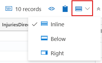 Selezionare l'icona in alto a destra della griglia dei risultati per cambiare le modalità del riquadro di lettura. Scegliere tra le modalità del riquadro di lettura seguenti: Inline, Below e Right.