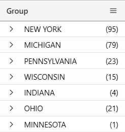 Nella griglia fare doppio clic su un record per espandere e visualizzare i record per tale stato. Ad esempio, espandere i record per "INDIANA". Questo tipo di raggruppamento è utile quando si esegue l'analisi esplorativa.