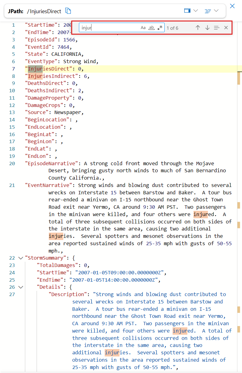 StormSummarycolonna, che deve essere l'ultima colonna.Selezionare campi diversi all'interno del risultato e vedere come cambia JPATH nella parte superiore della finestra. Ad esempio, lo screenshot seguente mostra il percorso del