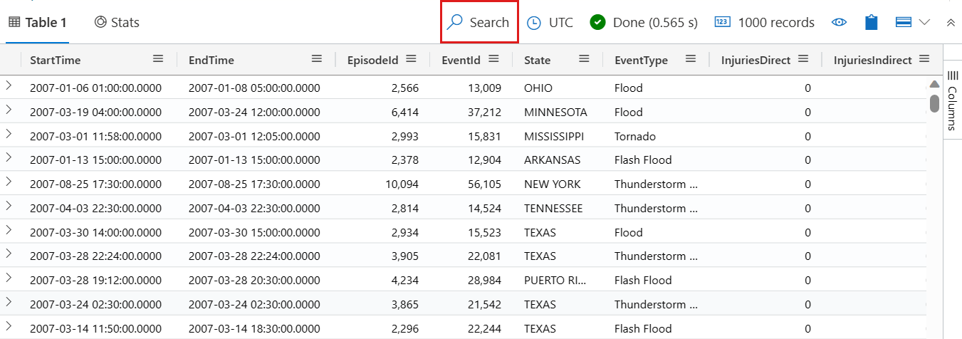StormEvents | where DamageProperty > 5000 | take 1000Nel menu in alto della griglia dei risultati, sul lato destro, selezionare Cerca e digitare "Wabash".